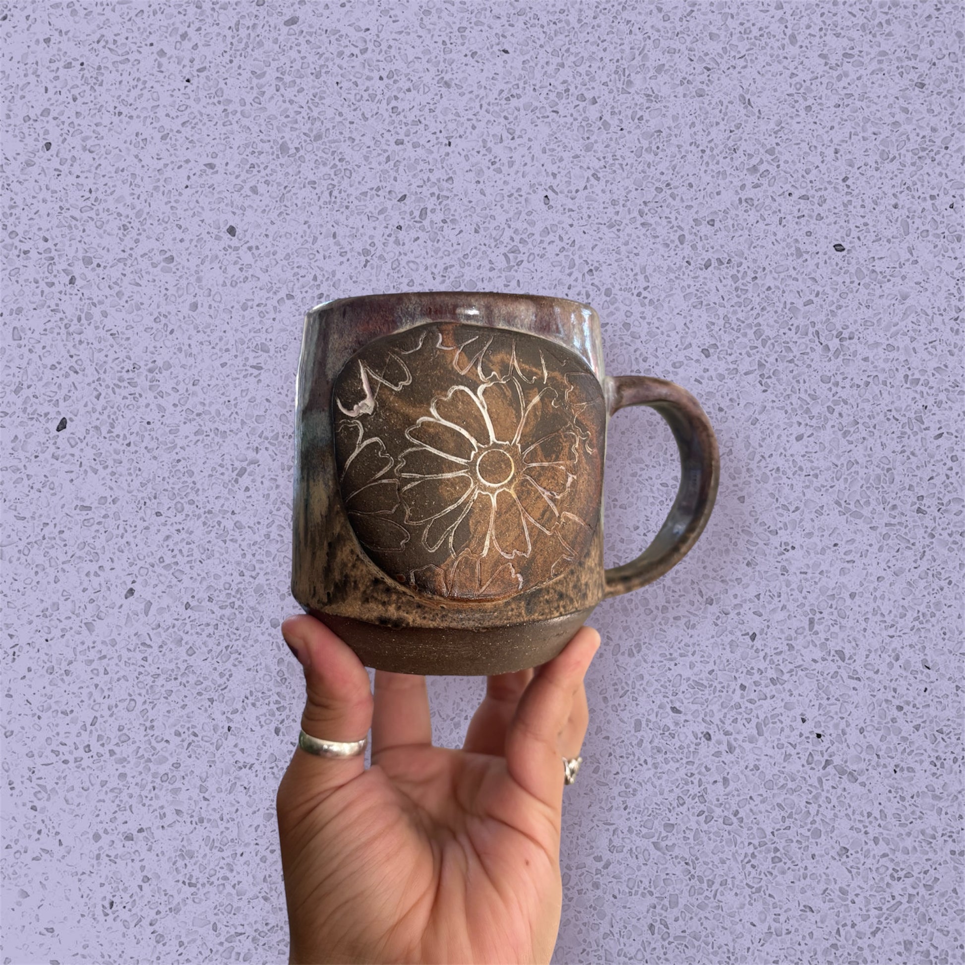 wheel thrown mug with stamped floral print on a dark chocolate clay body.